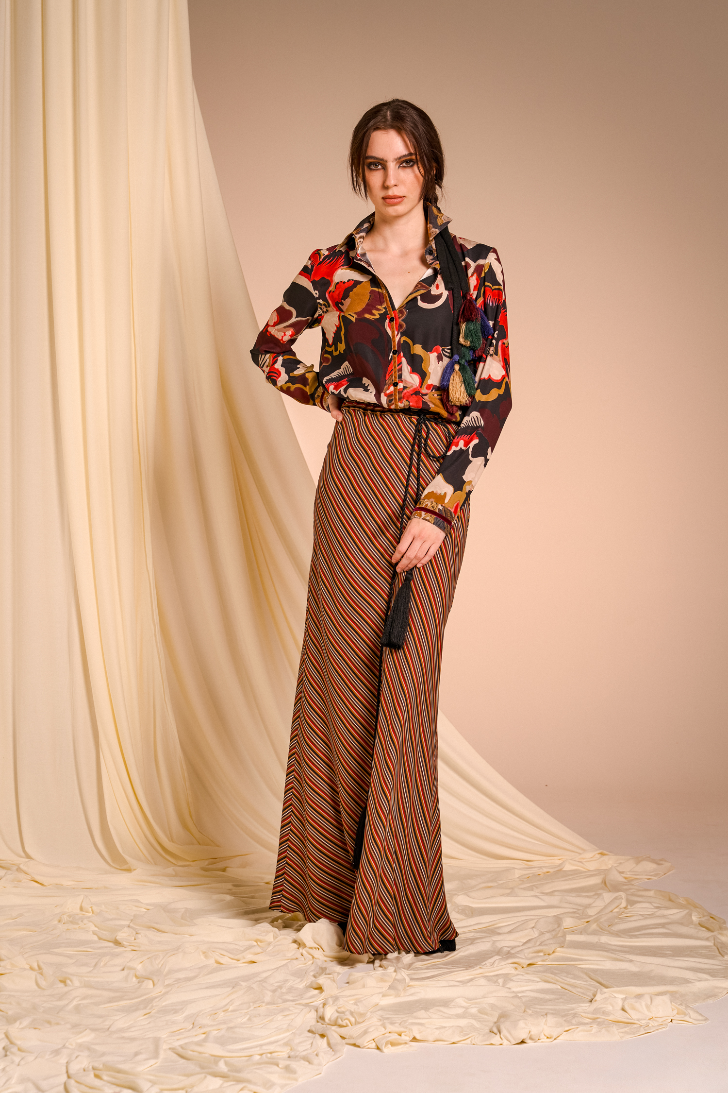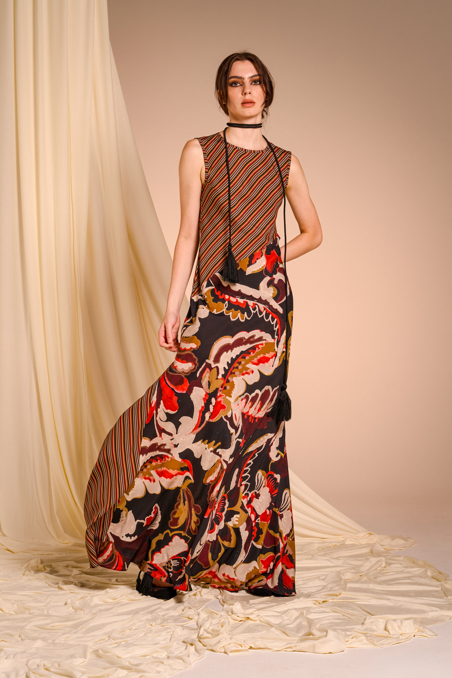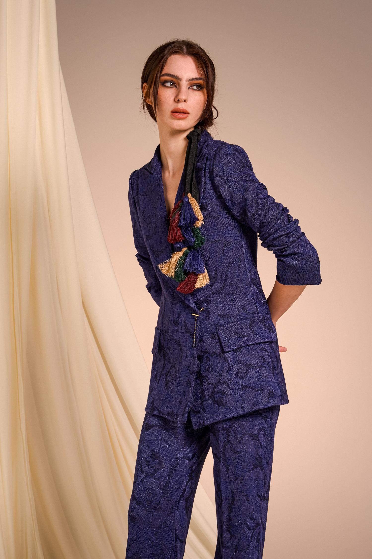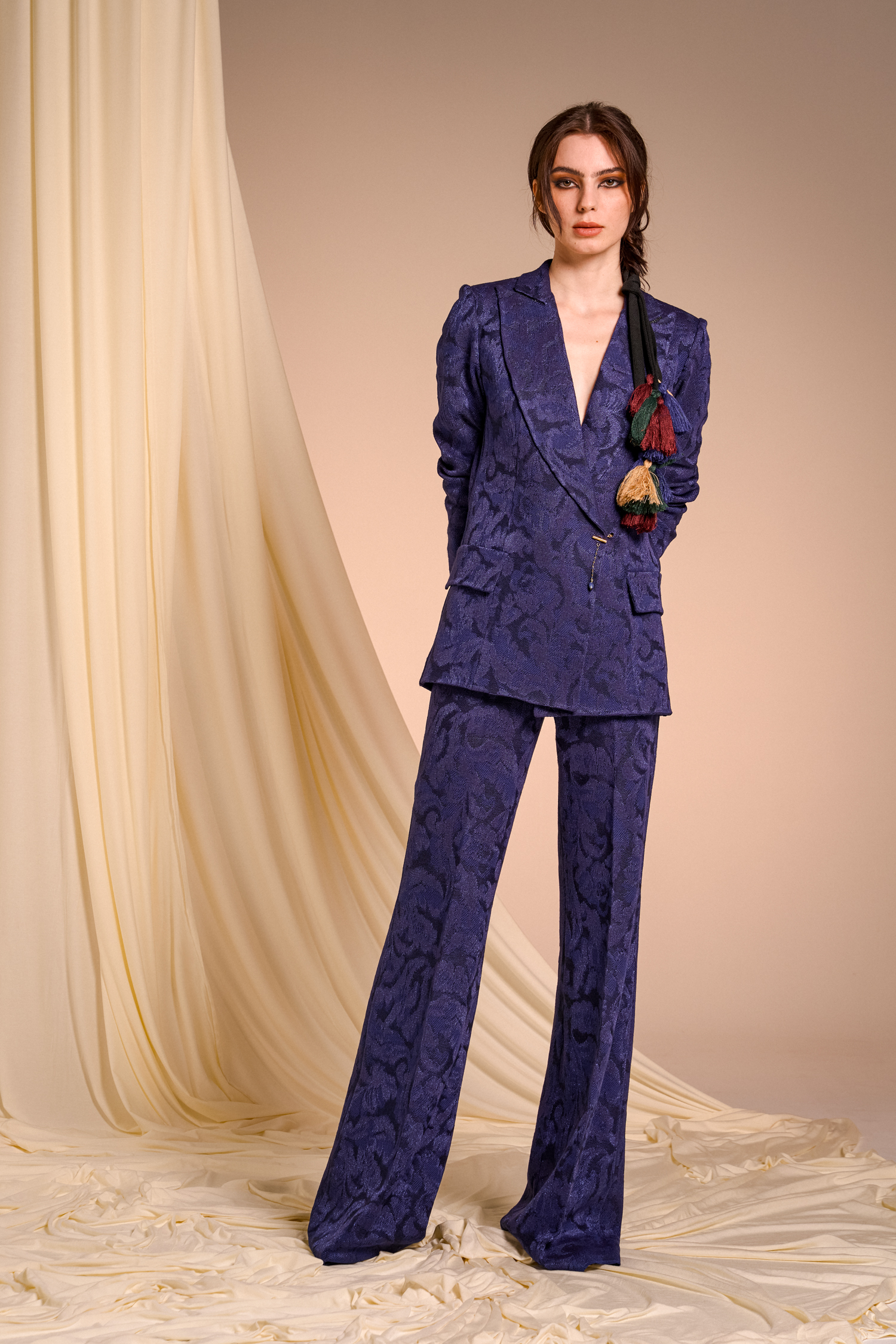 Precious brocade jacquards pair with silks featuring evocative prints, recalling the opulence of ancient nobility reinterpreted in a contemporary and minimalist key that surprises and convinces.