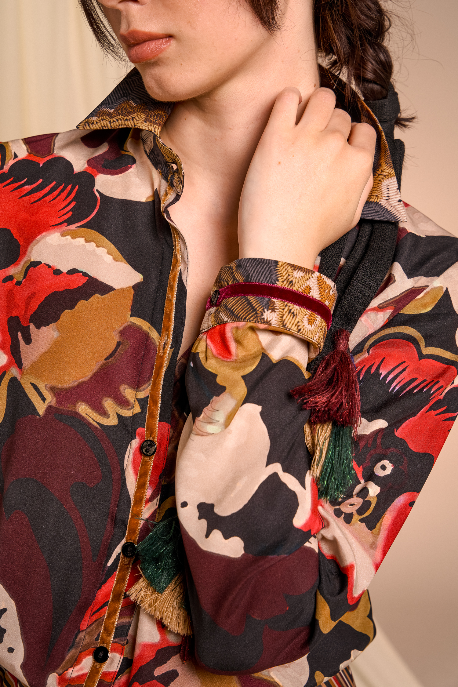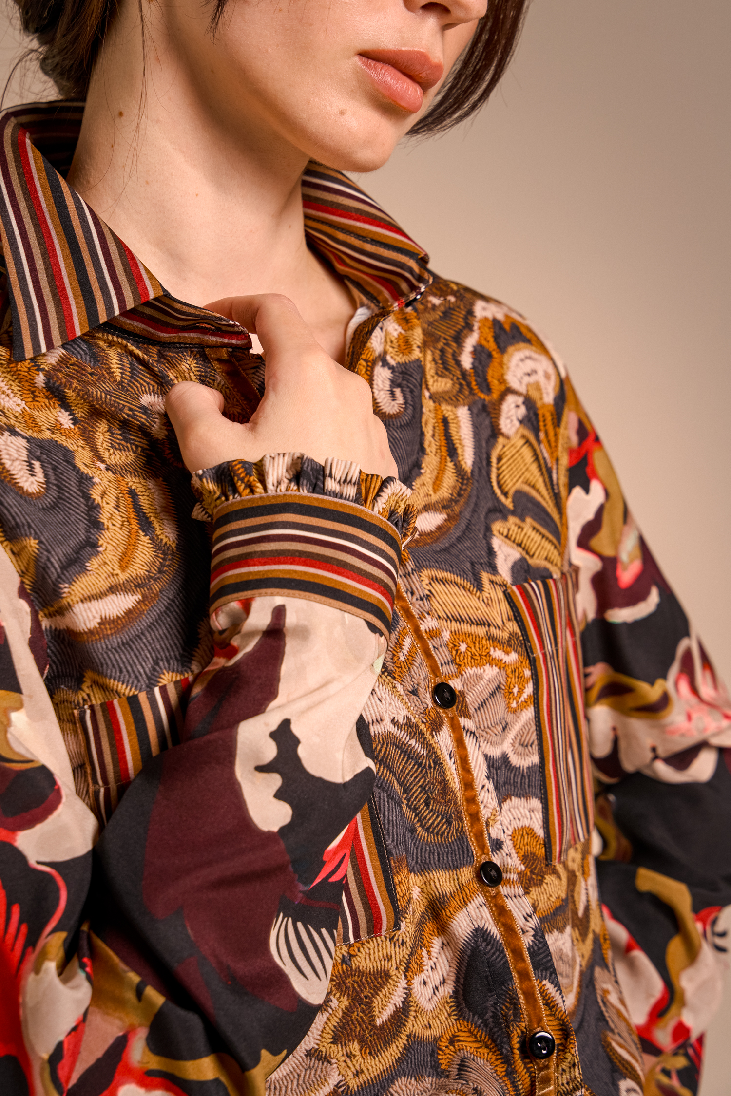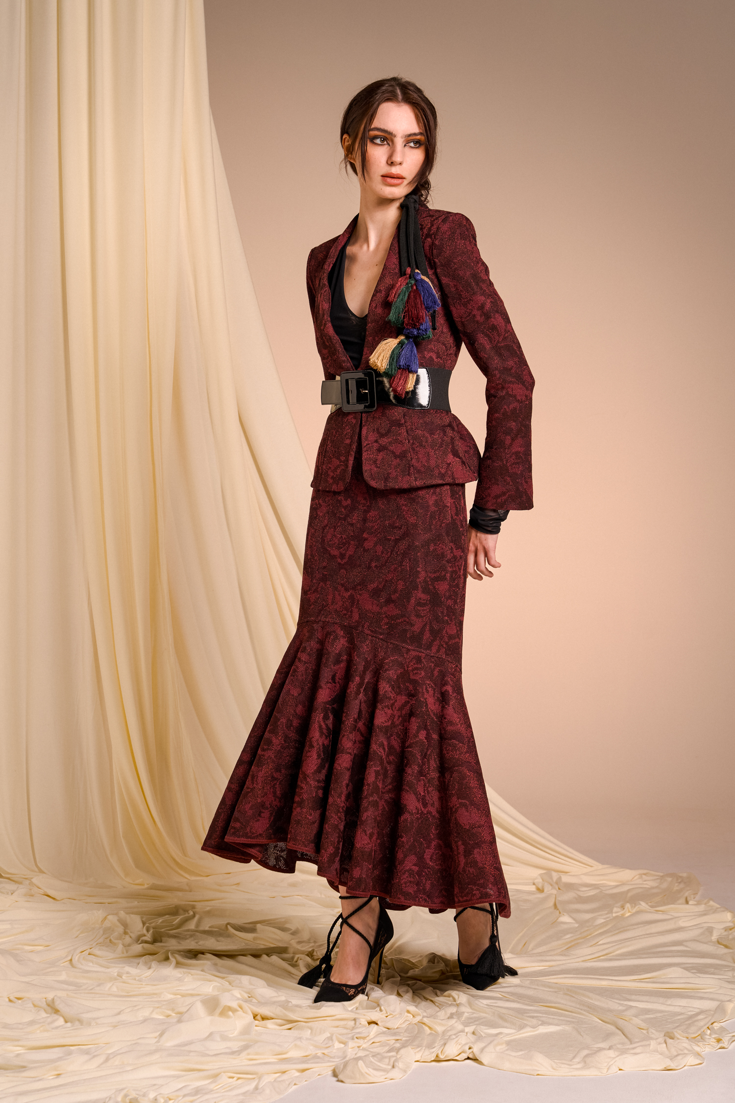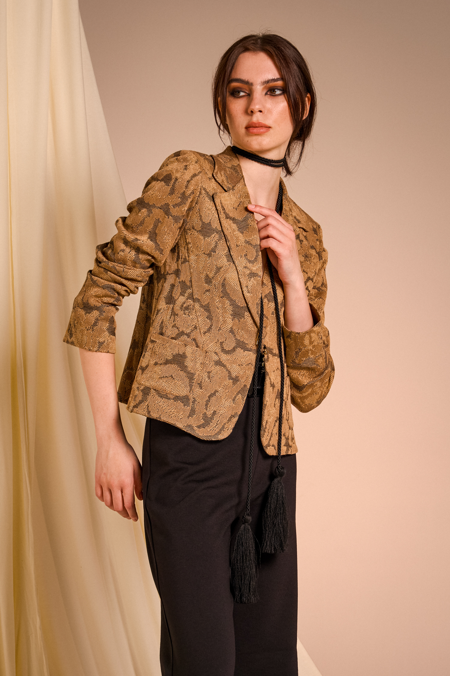 Precious brocade jacquards pair with silks featuring evocative prints, recalling the opulence of ancient nobility reinterpreted in a contemporary and minimalist key that surprises and convinces.