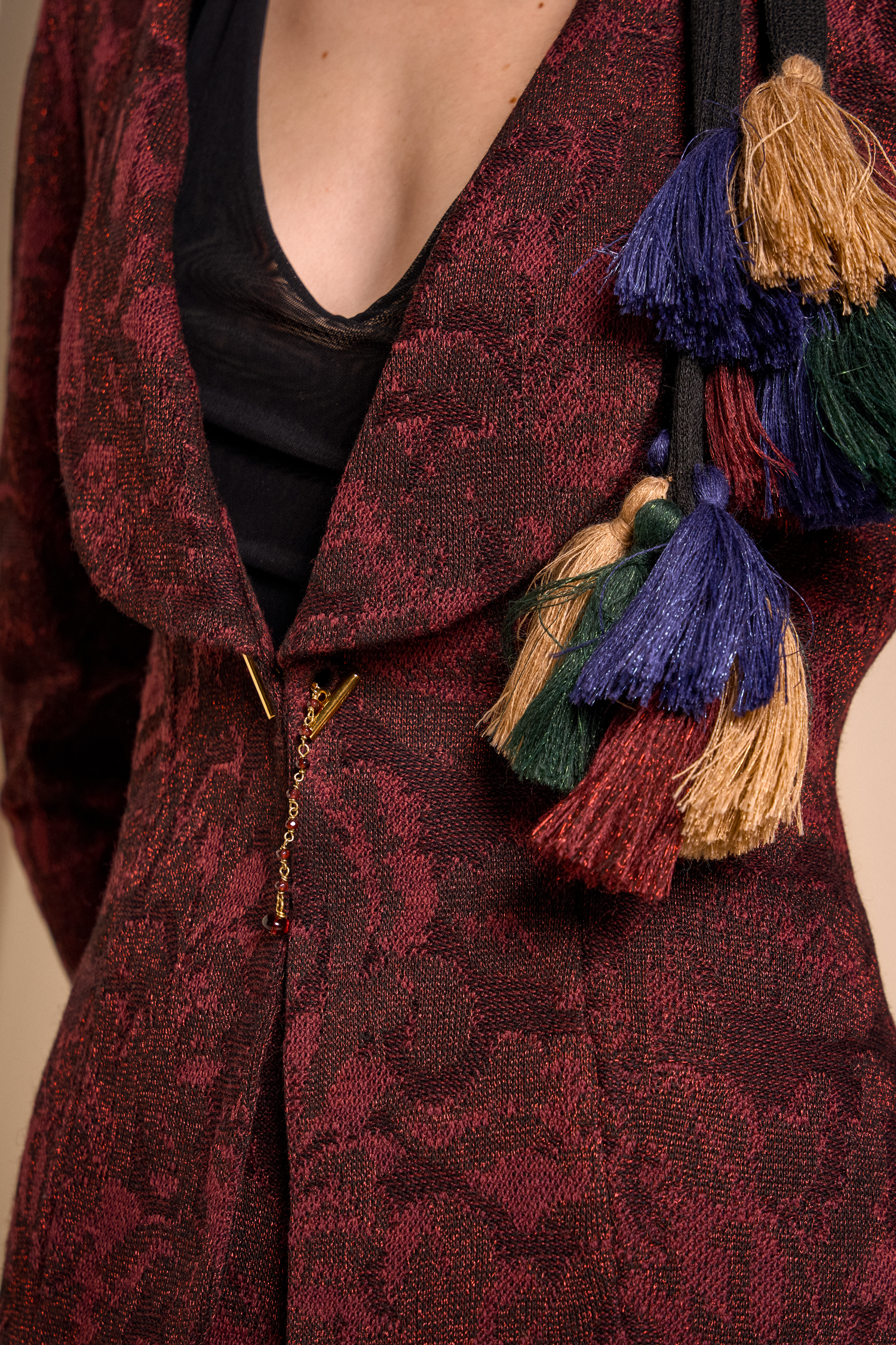 Sought-after and unexpected details make each piece inimitable and full of charm: from colorful tassels to embossed prints, from hand-embroidered stones to delicate tulles that wrap around like a cloud, and retro-style fringes.